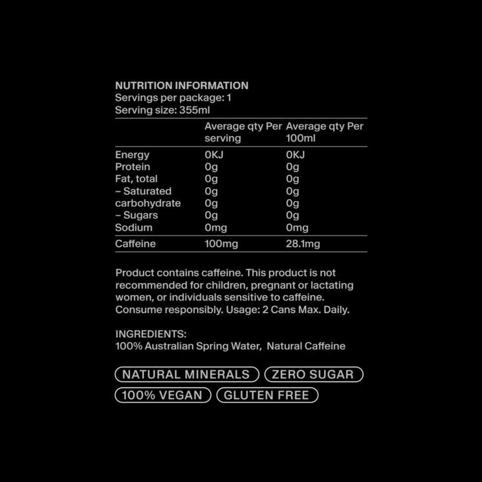 100% still, Australian spring water + 100mg of natural caffeine. That's it.